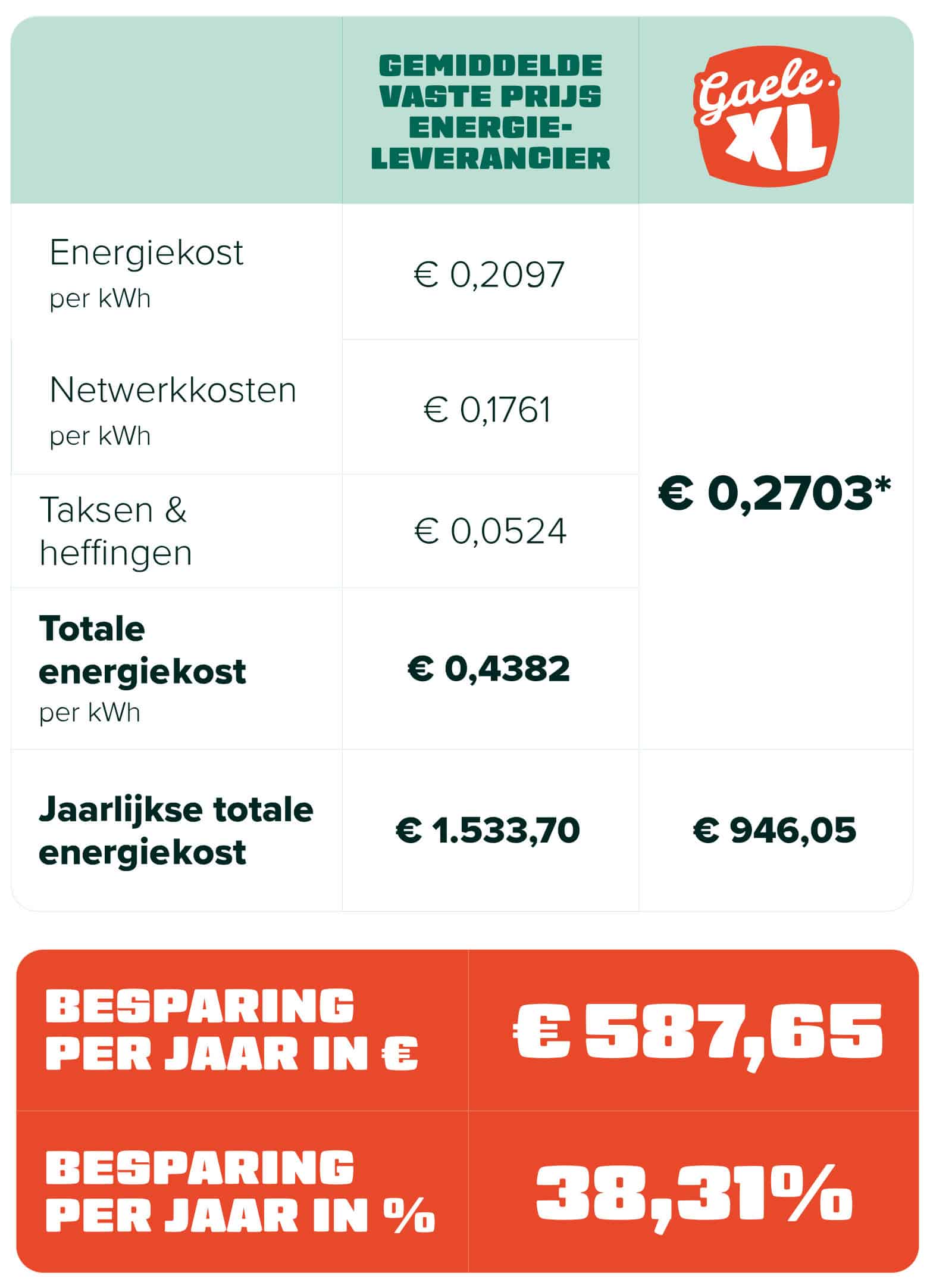 Bij andere energieleveranciers betaal je gemiddeld € 0,3901/kWh, bij ons slechts € 0,2703/kWh (incl. btw). Een superscherp vast energietarief, waarmee je elk jaar maar liefst € 587,65 terugverdient! En dat 25 jaar lang.